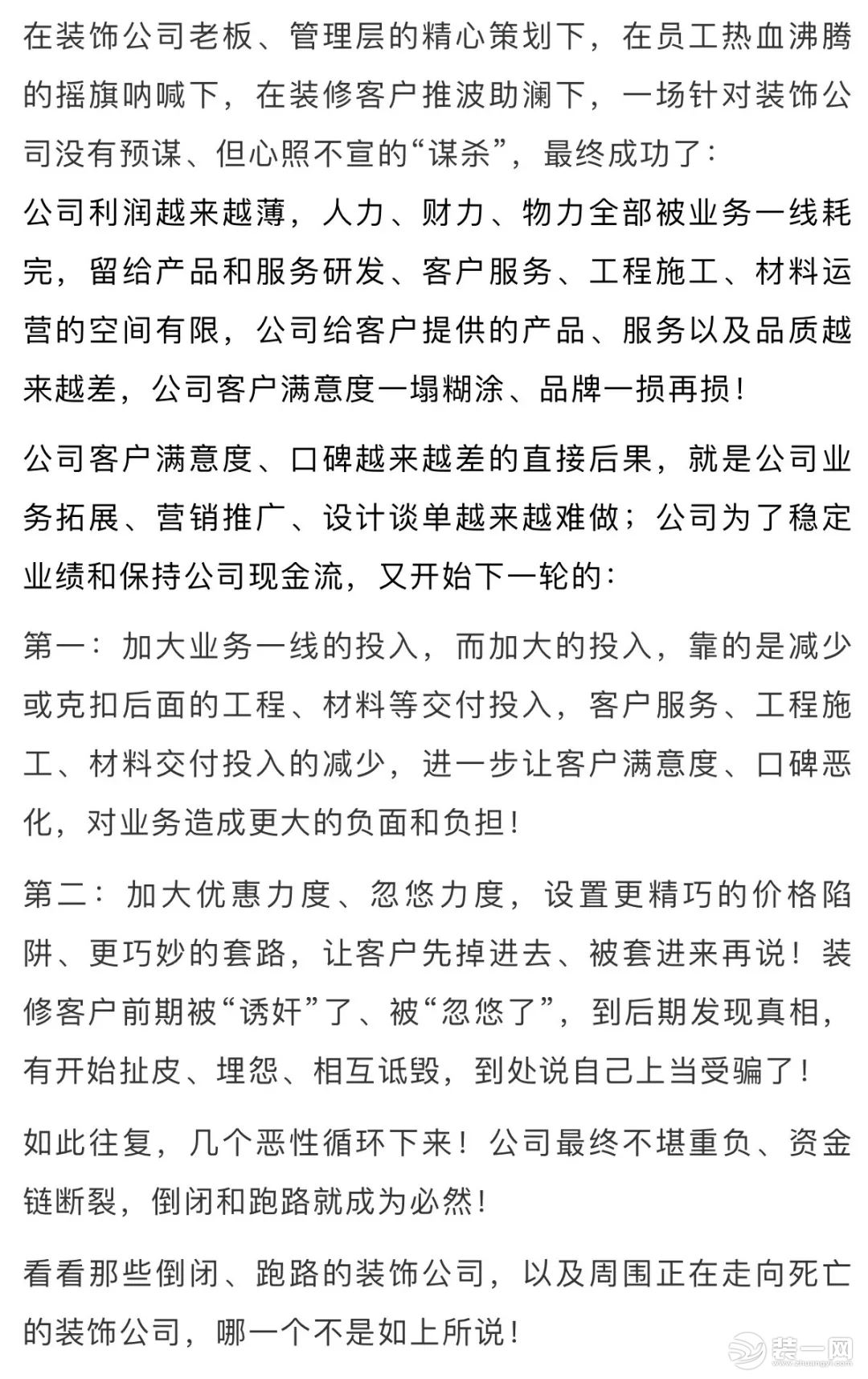 對(duì)于裝修行業(yè)出現(xiàn)的倒閉、跑路倒閉潮,喻老師對(duì)每一家倒閉的裝飾公司進(jìn)行跟蹤分析。最終,總結(jié)一條:過(guò)渡營(yíng)銷!